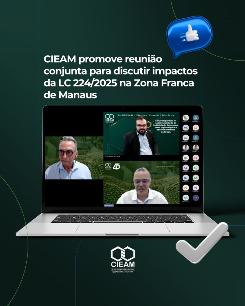 O Centro da Indústria do Estado do Amazonas (CIEAM) realizou, nesta terça-feira (20/01), uma reunião conjunta entre a Comissão CIEAM de Tributos e a Comissão CIEAM de Assuntos Jurídicos para debater os impactos da Lei Complementar nº 224/2025 na Zona Franca de Manaus. O encontro ocorreu por videoconferência, reunindo profissionais das áreas tributária, contábil, fiscal e jurídica, e contou com a participação do Presidente Executivo da entidade, Lúcio Flávio Morais de Oliveira.